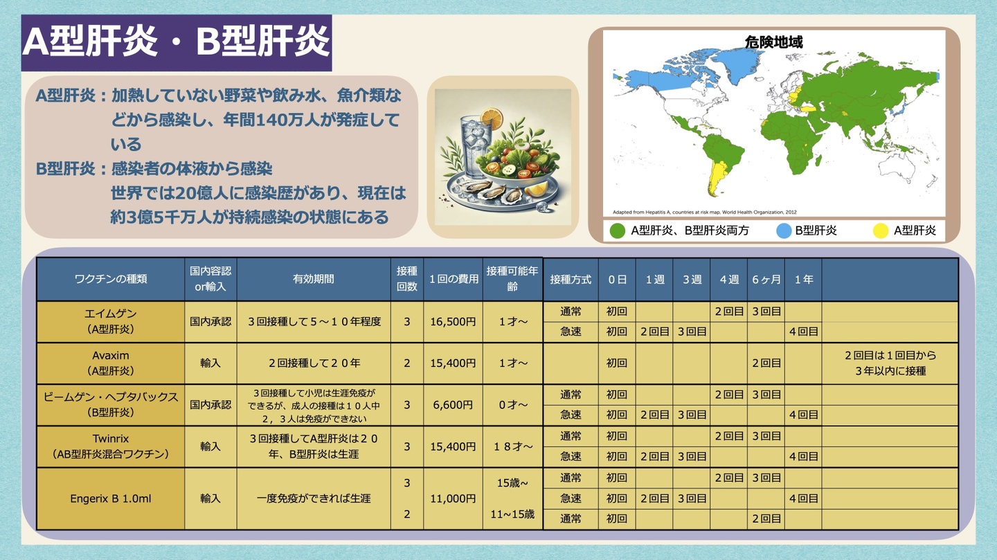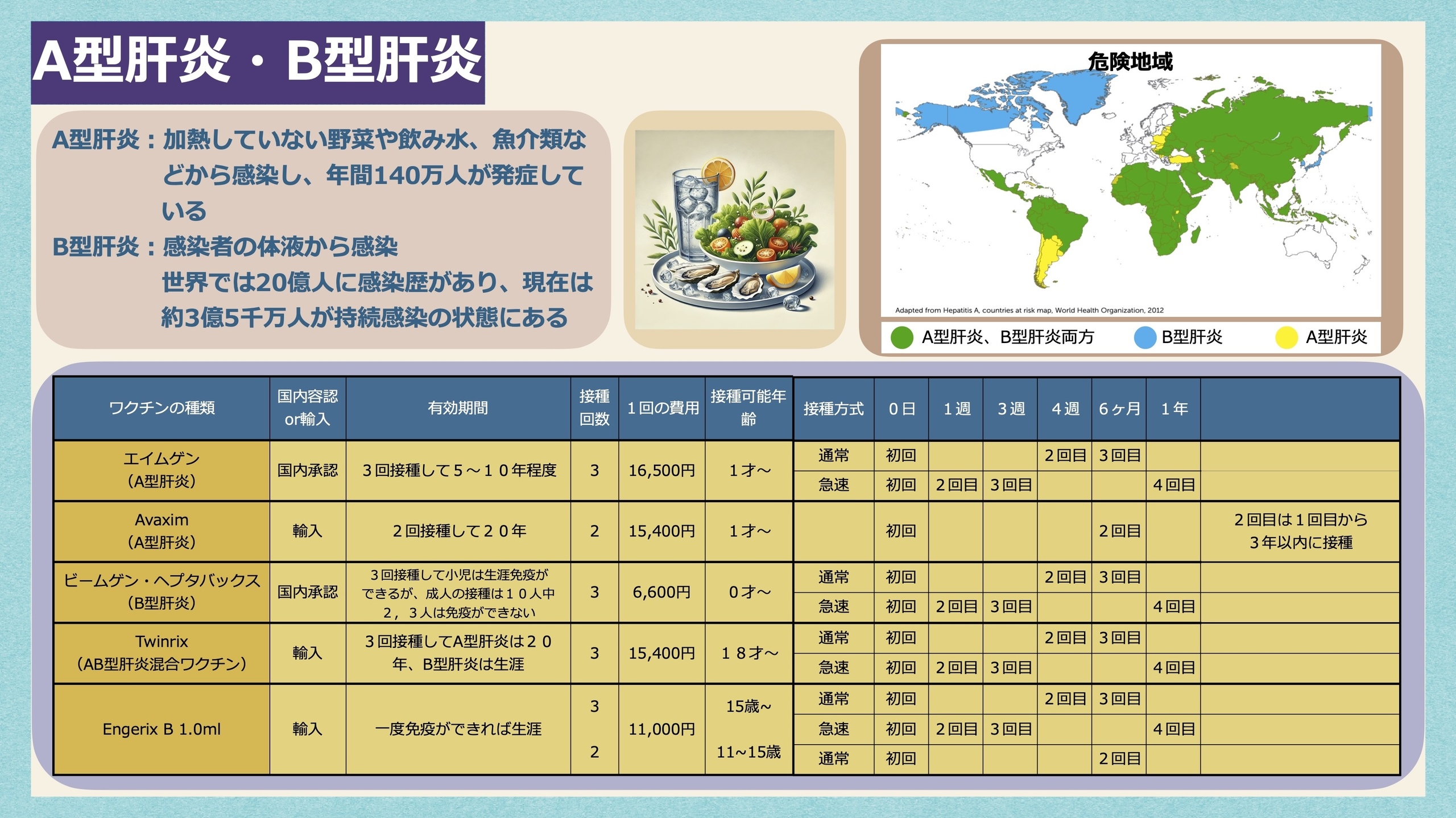 また、A型肝炎ワクチンも必要な方にはAB型肝炎混合ワクチンを推奨しております。 輸入ワクチンのA型肝炎とB型肝炎が混合になっているTwinrixには国産のB型肝炎ワクチンの2倍の抗原量が含まれているため、成人で接種した場合でも、多くの方が抗体がつくようになります。 通常国内で接種されているB型肝炎ワクチンの場合は、成人で接種すると10人中2〜3人の方で抗体がつかなくなります。 A型肝炎の予防効果は15〜20年となります。