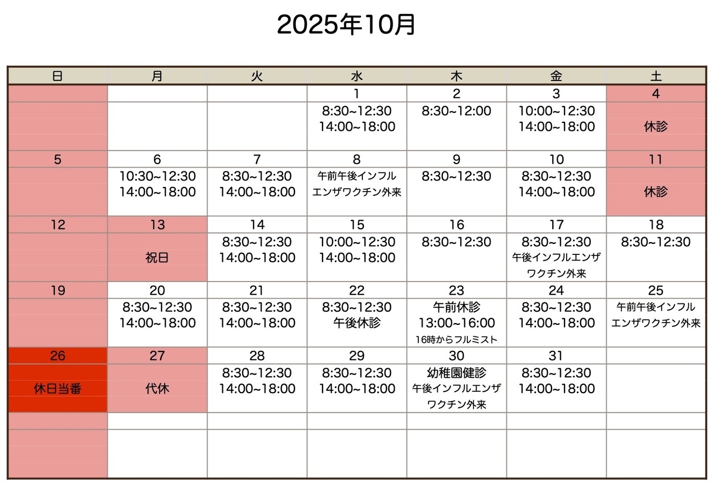 - 10月15日水曜日は保育園健診のため午前10時からの診療となります。