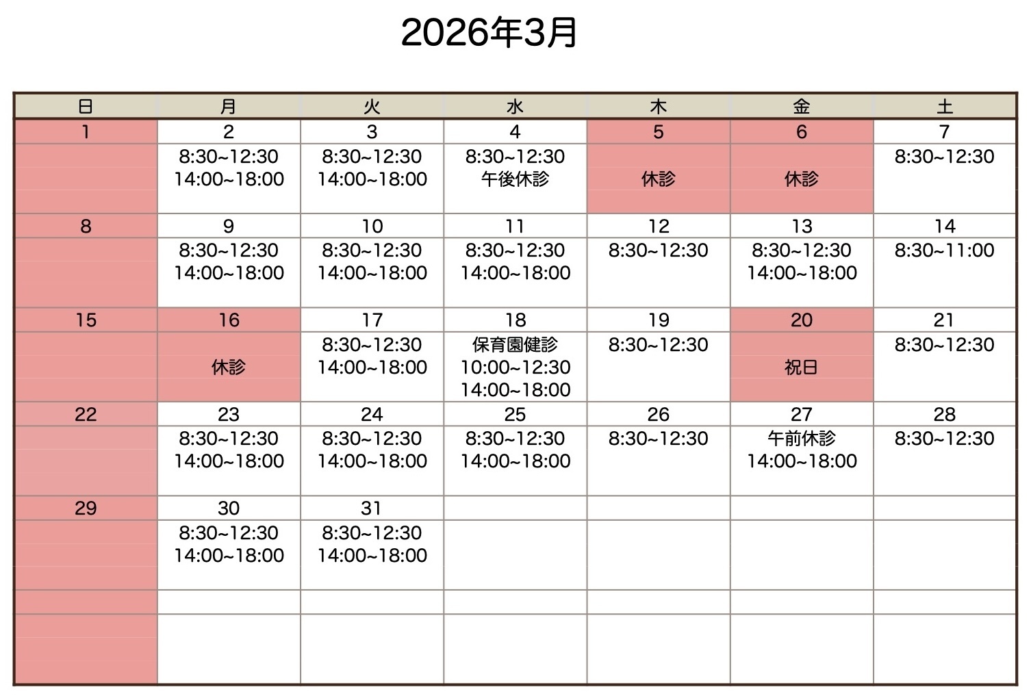 - 3月18日水曜日は保育園健診のため午前10時からの診療となります。